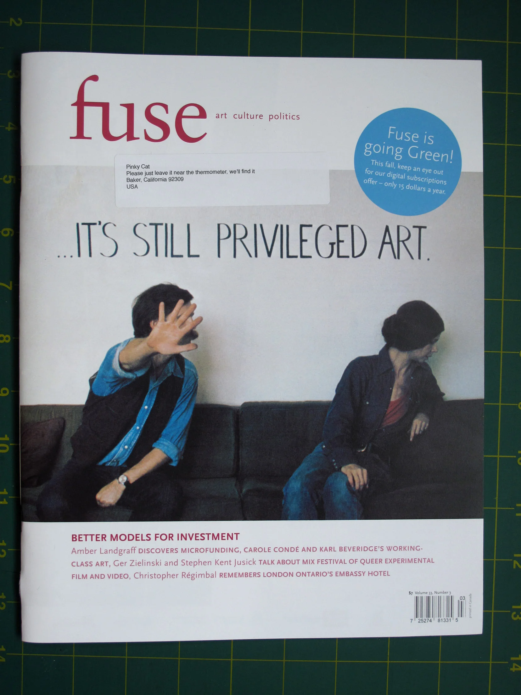 A few months ago the people at FUSE magazine (www.fusemagazine.org) asked us if we'd like to contribute a cartoon to their magazine. Of course we said YES (we like to try new things). And, well, our first comic finally came out in the current issue - Volume 33 Number 3 for those of you who are curious - and wow, it was really neat for us to see a Pinky Show comic in a magazine. We are on the last page. And not to pat ourselves on the head too much (because that's bad manners, right?) but we really like the way it came out and I can imagine doing all kinds of neat things in a comic format!